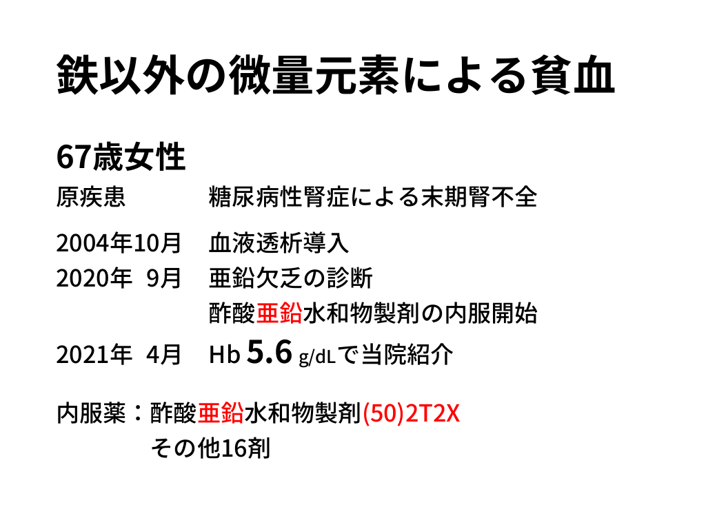 #32. 鉄以外の微量元素による貧血 67歳女性 原疾患  糖尿病性腎症による末期腎不全  2004年10月 2020年09月  血液透析導入 亜鉛欠乏の診断 酢酸亜鉛水和物製剤の内服開始  2021年04月  Hb 5.6 g/dLで当院紹介  内服薬:酢酸亜鉛水和物製剤(50)2T2X その他16剤
