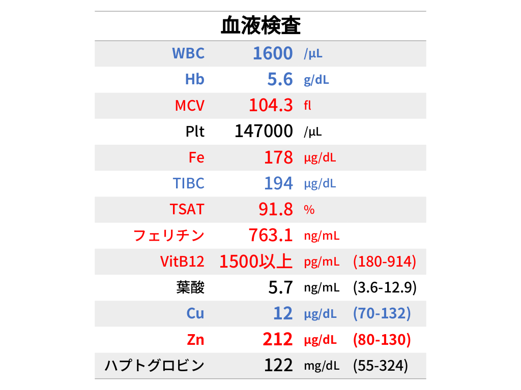 #34. 血液検査 WBC  1600  Hb  5.6  MCV  104.3 147000 178 194 91.8 763.1 1500以上 5.7 12 212 122  Plt Fe  TIBC TSAT フェリチン  VitB12 葉酸 Cu  Zn ハプトグロビン  /μL g/dL  fl /μL μg/dL  μg/dL % ng/mL  pg/mL  (180-914)  ng/mL  (3.6-12.9)  μg/dL  (70-132)  μg/dL  (80-130)  mg/dL  (55-324)