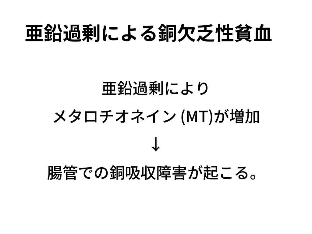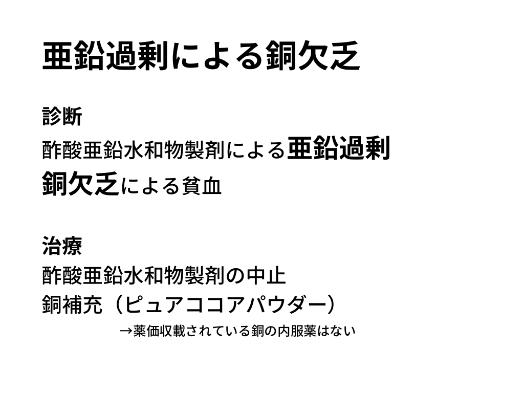 #35. 亜鉛過剰による銅欠乏 診断 酢酸亜鉛水和物製剤による亜鉛過剰  銅欠乏による貧血 治療 酢酸亜鉛水和物製剤の中止 銅補充(ピュアココアパウダー) →薬価収載されている銅の内服薬はない