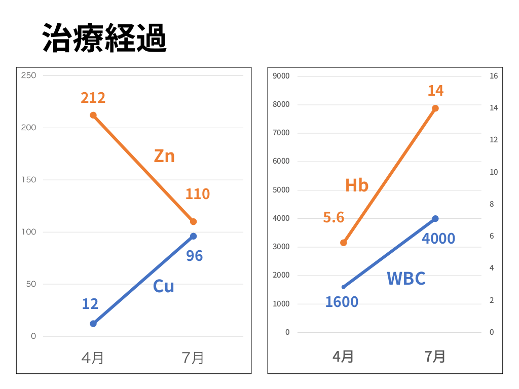 #36. 治療経過 9000  16  14  212  8000  14  7000  Zn  6000  110  96 12  8  5.6 4000  3000  WBC  2000  1000  10  Hb  5000  4000  Cu  12  1600  6  4  2  0  0  4月  7月