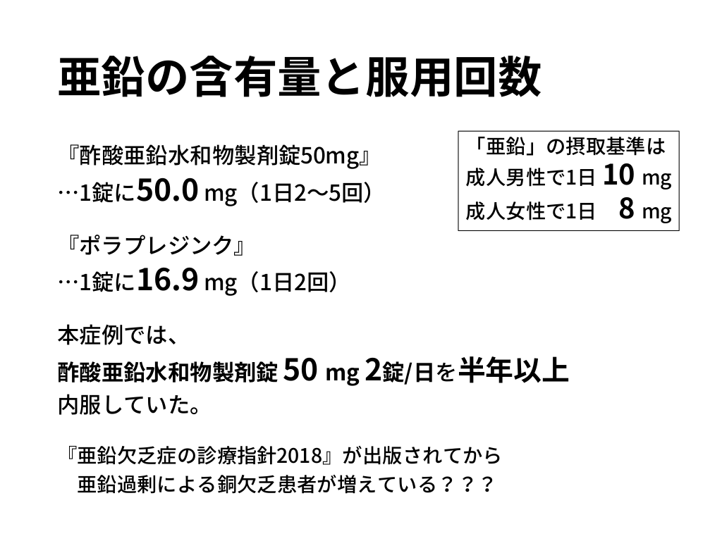 #38. 亜鉛の含有量と服用回数 『酢酸亜鉛水和物製剤錠50mg』 …1錠に50.0 mg(1日2~5回)  「亜鉛」の摂取基準は  成人男性で1日 10 mg 成人女性で1日 08 mg  『ポラプレジンク』  …1錠に16.9 mg(1日2回) 本症例では、 酢酸亜鉛水和物製剤錠 50 mg 2錠/日を半年以上 内服していた。 『亜鉛欠乏症の診療指針2018』が出版されてから 亜鉛過剰による銅欠乏患者が増えている???