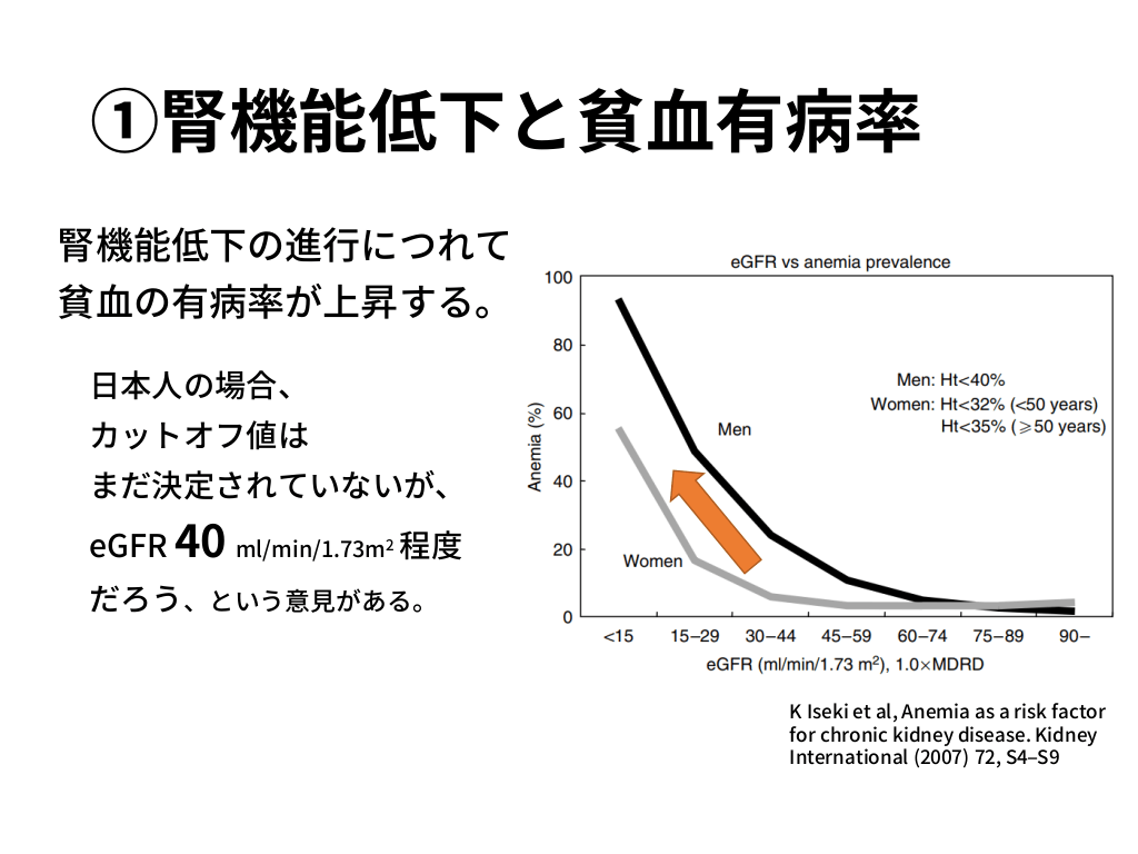 #4. ①腎機能低下と貧血有病率 腎機能低下の進行につれて 貧血の有病率が上昇する。 日本人の場合、 カットオフ値は まだ決定されていないが、  eGFR 40 ml/min/1.73m2 程度 だろう、という意見がある。  K Iseki et al, Anemia as a risk factor for chronic kidney disease. Kidney International (2007) 72, S4–S9