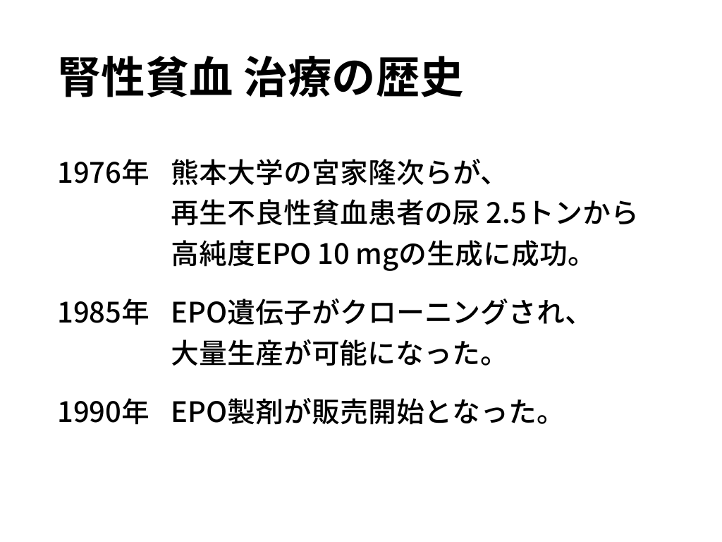 #40. 腎性貧血 治療の歴史 1976年 熊本大学の宮家隆次らが、 再生不良性貧血患者の尿 2.5トンから 高純度EPO 10 mgの生成に成功。  1985年 EPO遺伝子がクローニングされ、 大量生産が可能になった。 1990年 EPO製剤が販売開始となった。