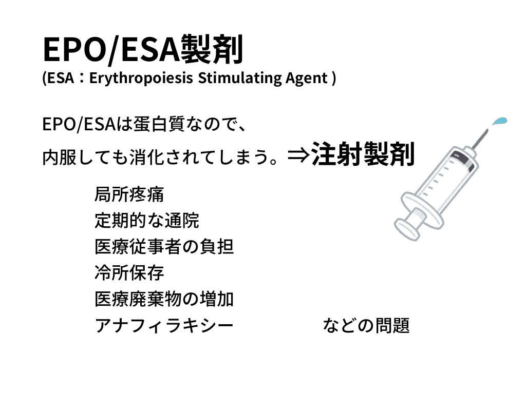 #41. EPO/ESA製剤 (ESA:Erythropoiesis Stimulating Agent )  EPO/ESAは蛋白質なので、  内服しても消化されてしまう。⇒注射製剤 局所疼痛 定期的な通院 医療従事者の負担 冷所保存 医療廃棄物の増加 アナフィラキシー  などの問題