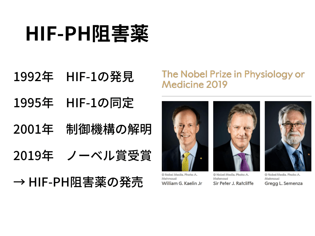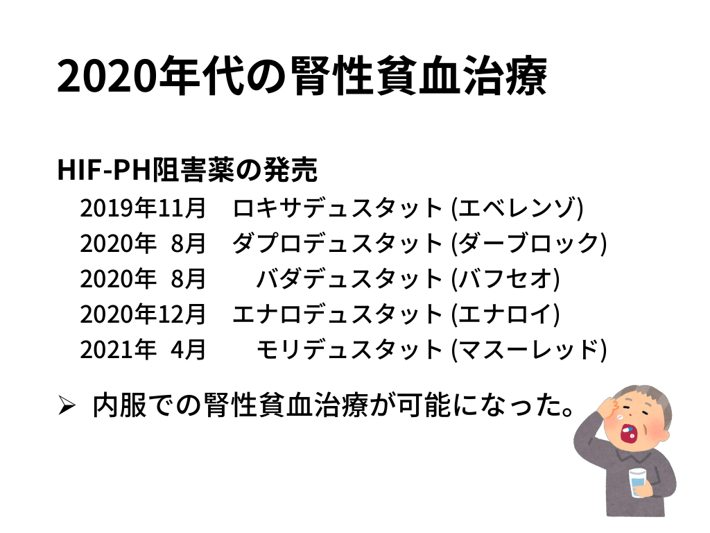#42. 2020年代の腎性貧血治療 HIF-PH阻害薬の発売 2019年11月 ロキサデュスタット (エベレンゾ) 2020年08月 ダプロデュスタット (ダーブロック) 2020年08月 バダデュスタット (バフセオ) 2020年12月 エナロデュスタット (エナロイ) 2021年04月 モリデュスタット (マスーレッド)   内服での腎性貧血治療が可能になった。