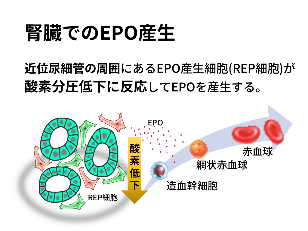 #44. 腎臓でのEPO産生 近位尿細管の周囲にあるEPO産生細胞(REP細胞)が  酸素分圧低下に反応してEPOを産生する。 EPO  酸 素 低 下 REP細胞  赤血球 網状赤血球  造血幹細胞