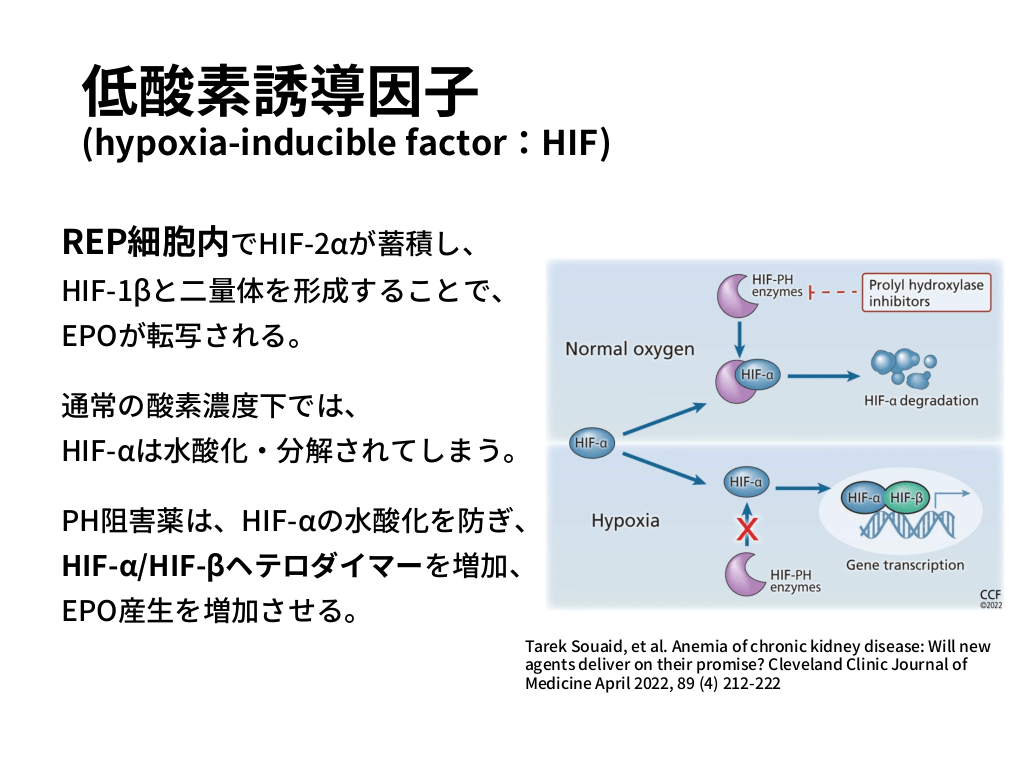 #45. 低酸素誘導因子  (hypoxia-inducible factor:HIF) REP細胞内でHIF-2αが蓄積し、 HIF-1βと二量体を形成することで、 EPOが転写される。 通常の酸素濃度下では、  HIF-αは水酸化・分解されてしまう。 PH阻害薬は、HIF-αの水酸化を防ぎ、 HIF-α/HIF-βヘテロダイマーを増加、  EPO産生を増加させる。 Tarek Souaid, et al. Anemia of chronic kidney disease: Will new agents deliver on their promise? Cleveland Clinic Journal of Medicine April 2022, 89 (4) 212-222