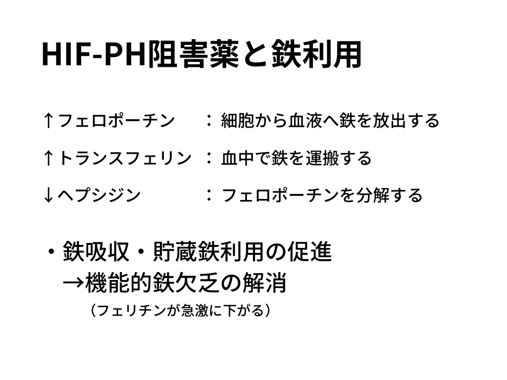 #46. HIF-PH阻害薬と鉄利用 ↑フェロポーチン  : 細胞から血液へ鉄を放出する  ↑トランスフェリン : 血中で鉄を運搬する ↓ヘプシジン  : フェロポーチンを分解する  ・鉄吸収・貯蔵鉄利用の促進 →機能的鉄欠乏の解消 (フェリチンが急激に下がる)