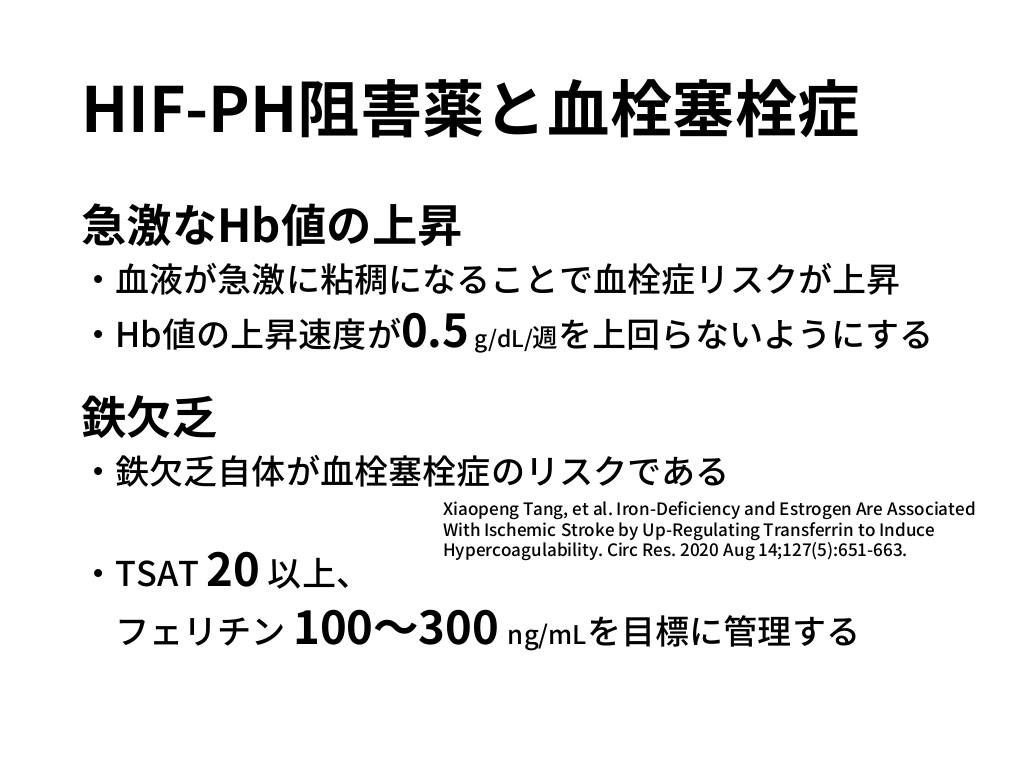#47. HIF-PH阻害薬と血栓塞栓症 急激なHb値の上昇 ・血液が急激に粘稠になることで血栓症リスクが上昇  ・Hb値の上昇速度が0.5 g/dL/週を上回らないようにする  鉄欠乏 ・鉄欠乏自体が血栓塞栓症のリスクである ・TSAT 20 以上、  Xiaopeng Tang, et al. Iron-Deficiency and Estrogen Are Associated With Ischemic Stroke by Up-Regulating Transferrin to Induce Hypercoagulability. Circ Res. 2020 Aug 14;127(5):651-663.  フェリチン 100~300 ng/mLを目標に管理する