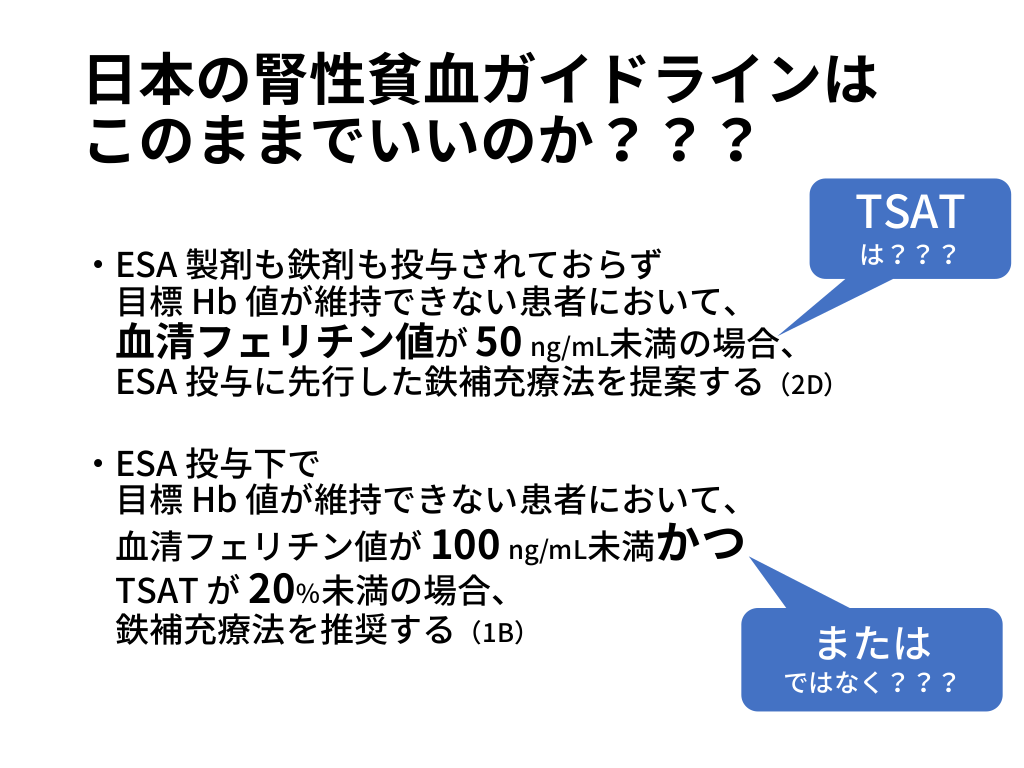 #48. 日本の腎性貧血ガイドラインは このままでいいのか??? TSAT ・ESA 製剤も鉄剤も投与されておらず 目標 Hb 値が維持できない患者において、 血清フェリチン値が 50 ng/mL未満の場合、 ESA 投与に先行した鉄補充療法を提案する(2D) ・ESA 投与下で 目標 Hb 値が維持できない患者において、 血清フェリチン値が 100 ng/mL未満かつ TSAT が 20%未満の場合、 鉄補充療法を推奨する(1B)  は???  または ではなく???