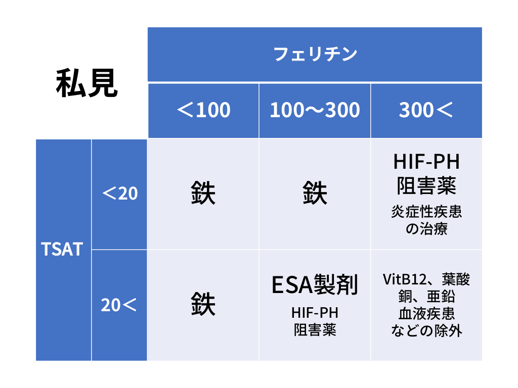 #49. 私見  <20  フェリチン  <100  鉄  100~300  鉄  300< HIF-PH 阻害薬 炎症性疾患 の治療  TSAT 20<  鉄  ESA製剤 HIF-PH 阻害薬  VitB12、葉酸 銅、亜鉛 血液疾患 などの除外