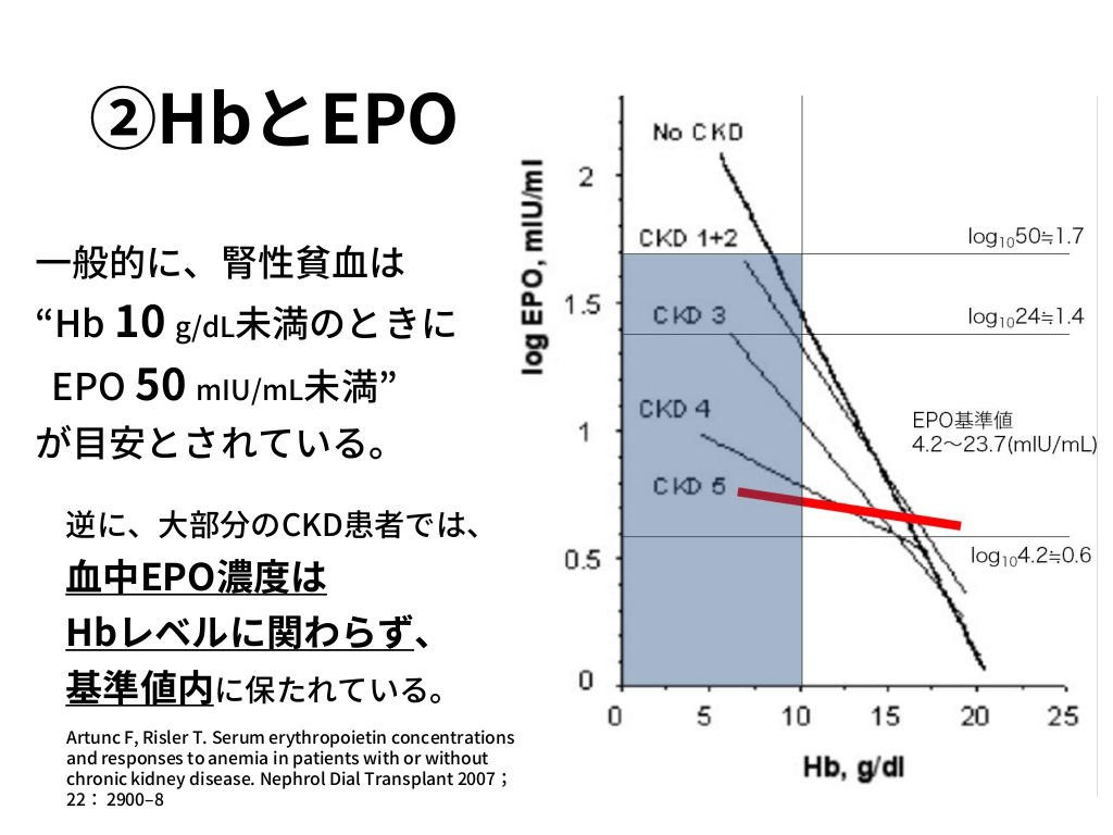 #5. ②HbとEPO 一般的に、腎性貧血は  “Hb 10 g/dL未満のときに EPO 50 mIU/mL未満” が目安とされている。 逆に、大部分のCKD患者では、  血中EPO濃度は Hbレベルに関わらず、 基準値内に保たれている。 Artunc F, Risler T. Serum erythropoietin concentrations and responses to anemia in patients with or without chronic kidney disease. Nephrol Dial Transplant 2007; 22: 2900‒8