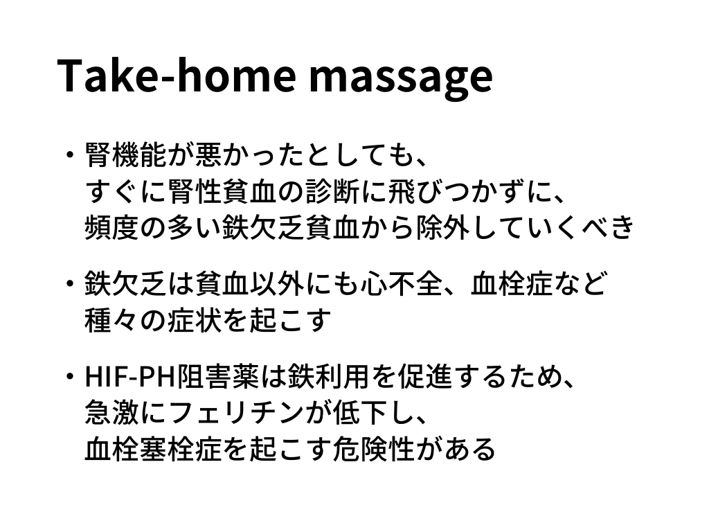 #50. Take-home massage ・腎機能が悪かったとしても、 すぐに腎性貧血の診断に飛びつかずに、 頻度の多い鉄欠乏貧血から除外していくべき ・鉄欠乏は貧血以外にも心不全、血栓症など 種々の症状を起こす ・HIF-PH阻害薬は鉄利用を促進するため、 急激にフェリチンが低下し、 血栓塞栓症を起こす危険性がある