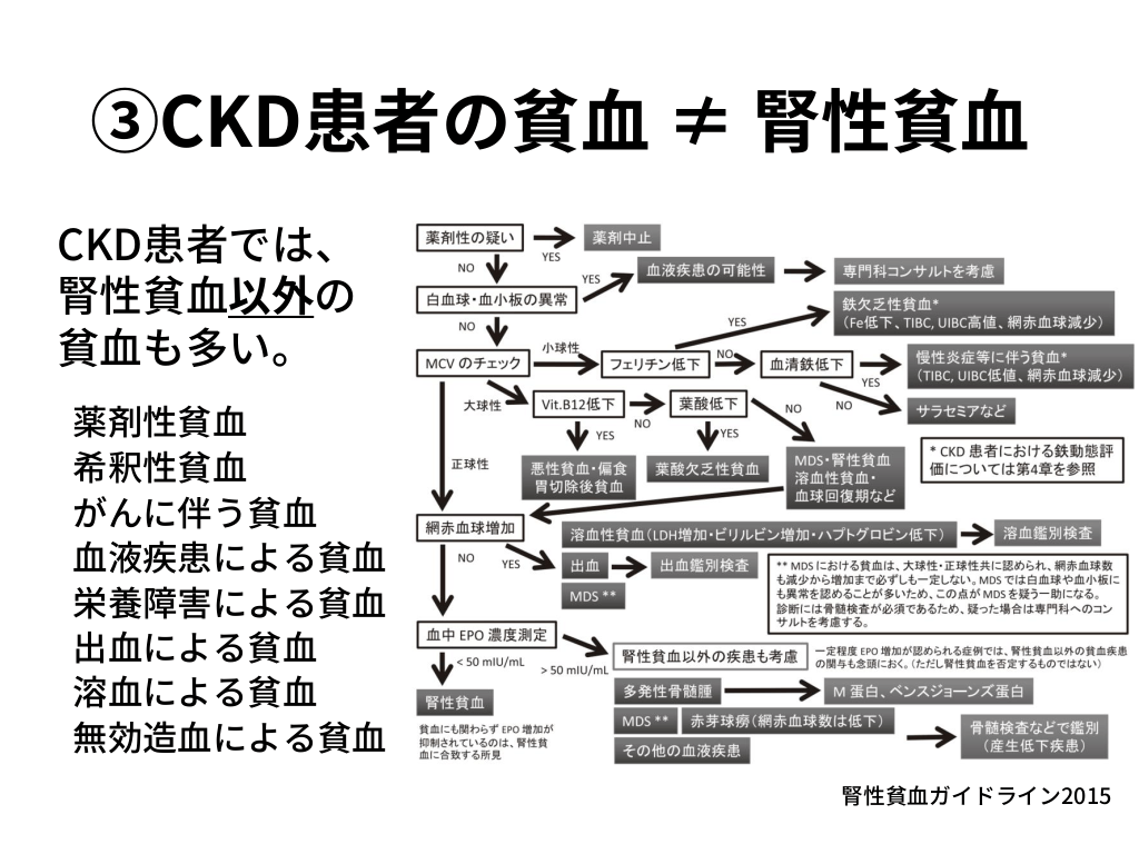 #6. ③CKD患者の貧血 ≠ 腎性貧血 CKD患者では、 腎性貧血以外の 貧血も多い。 薬剤性貧血 希釈性貧血 がんに伴う貧血 血液疾患による貧血 栄養障害による貧血 出血による貧血 溶血による貧血 無効造血による貧血 腎性貧血ガイドライン2015