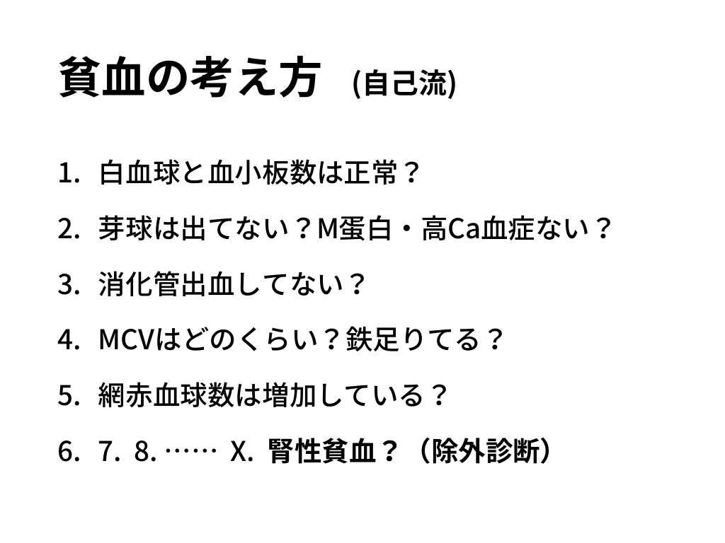 #7. 貧血の考え方  (自己流)  1. 白血球と血小板数は正常? 2. 芽球は出てない?M蛋白・高Ca血症ない? 3. 消化管出血してない? 4. MCVはどのくらい?鉄足りてる? 5. 網赤血球数は増加している? 6. 7. 8. …… X. 腎性貧血?(除外診断)