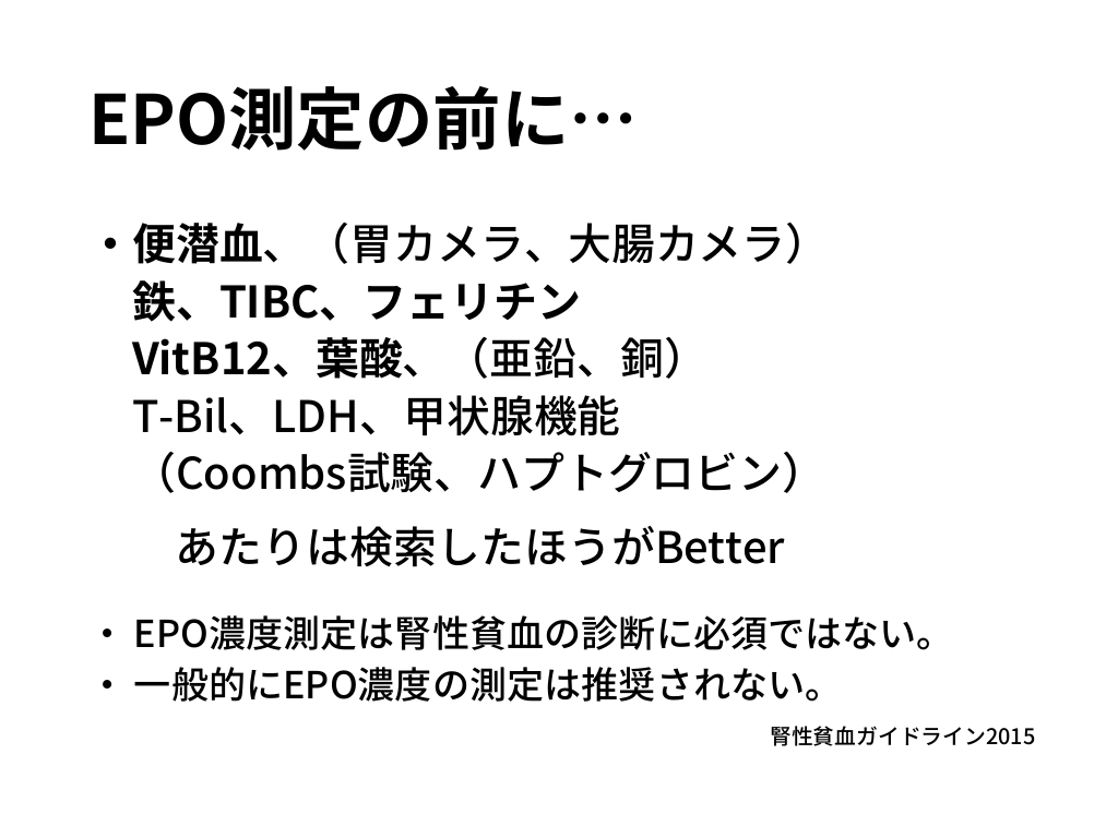 #8. EPO測定の前に… ・便潜血、(胃カメラ、大腸カメラ) 鉄、TIBC、フェリチン VitB12、葉酸、(亜鉛、銅) T-Bil、LDH、甲状腺機能 (Coombs試験、ハプトグロビン) あたりは検索したほうがBetter ・ EPO濃度測定は腎性貧血の診断に必須ではない。 ・ 一般的にEPO濃度の測定は推奨されない。 腎性貧血ガイドライン2015