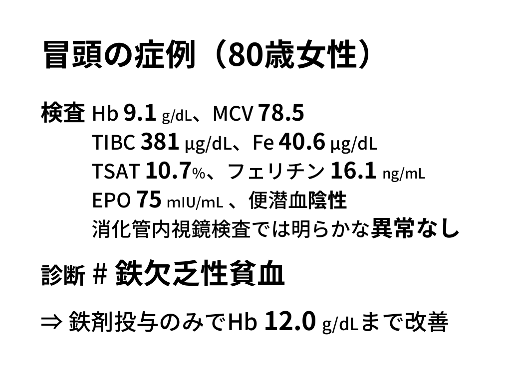 #9. 冒頭の症例(80歳女性) 検査 Hb 9.1 g/dL、MCV 78.5 TIBC 381 µg/dL、Fe 40.6 µg/dL TSAT 10.7%、フェリチン 16.1 ng/mL EPO 75 mIU/mL 、便潜血陰性 消化管内視鏡検査では明らかな異常なし 診断 # 鉄欠乏性貧血 ⇒ 鉄剤投与のみでHb 12.0 g/dLまで改善