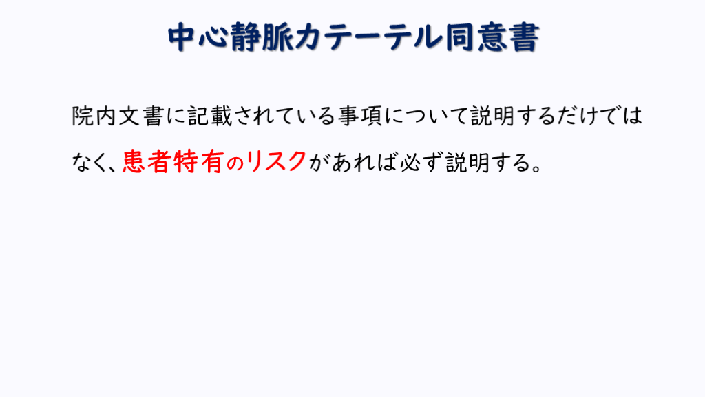#6. 中心静脈カテーテル同意書 院内文書に記載されている事項について説明するだけではなく、患者特有のリスクがあれば必ず説明する。