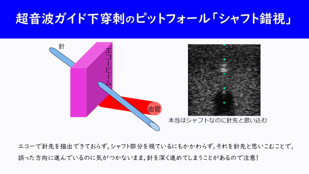 #10. 超音波ガイド下穿刺のピットフォール「シャフト錯視」 エコーで針先を描出できておらず,シャフト部分を視ているにもかかわらず,それを針先と思いこむことで,誤った方向に進んでいるのに気がつかないまま,針を深く進めてしまうことがあるので注意! 本当はシャフトなのに針先と思い込む