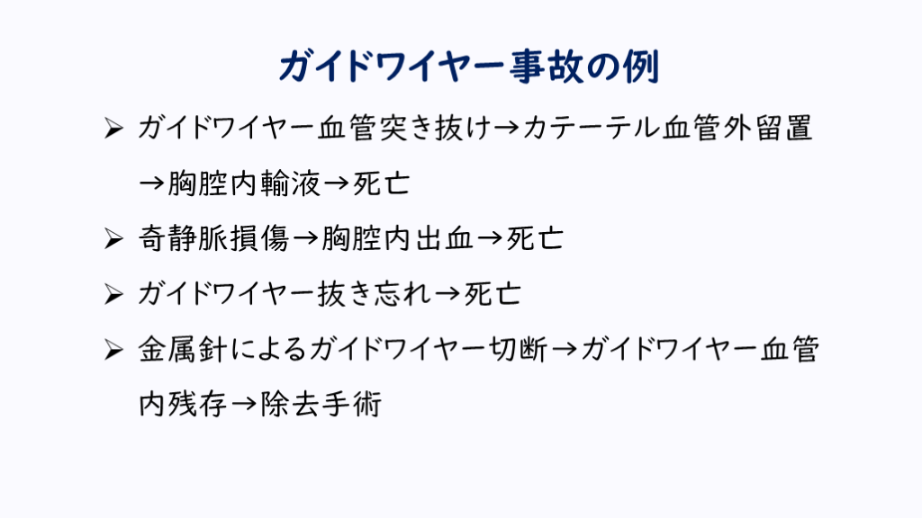 ガイドワイヤー血管突き抜け→カテーテル血管外留置→胸腔内輸液→死亡