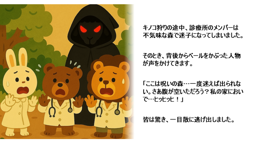 #4. キノコ狩りの途中、診療所のメンバーは不気味な森で迷子になってしまいました。
