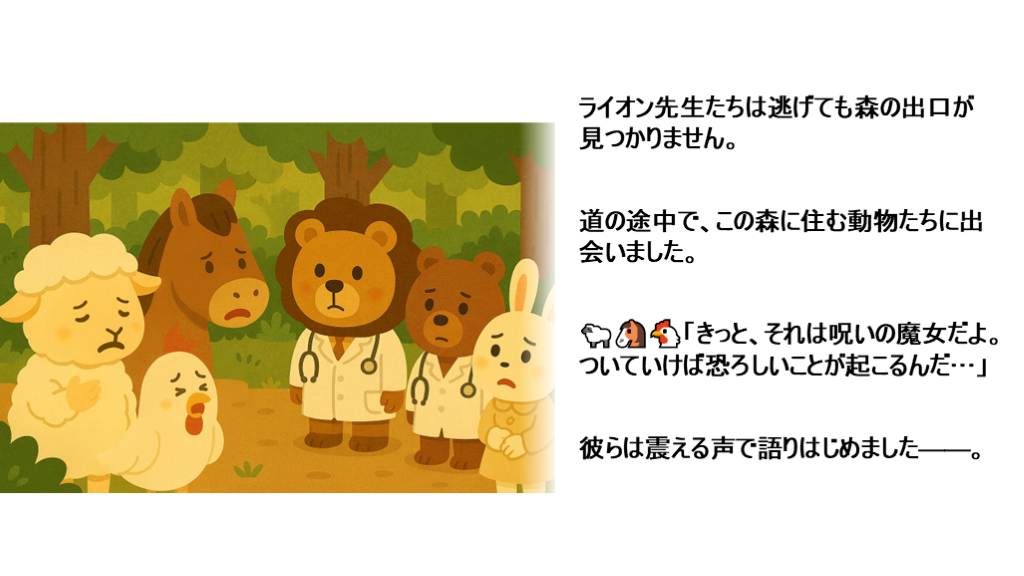 #5. ライオン先生たちは逃げても森の出口が見つかりません。