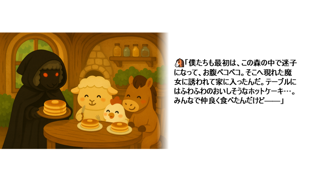 #6. 🐴「僕たちも最初は、この森の中で迷子になって、お腹ペコペコ。そこへ現れた魔女に誘われて家に入ったんだ。テーブルにはふわふわのおいしそうなホットケーキ…。みんなで仲良く食べたんだけど――」
