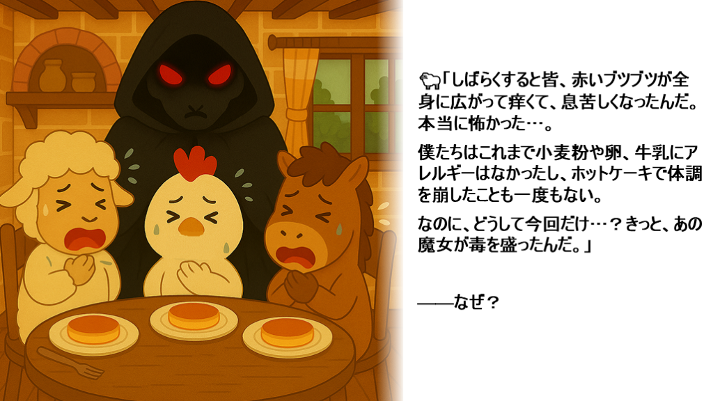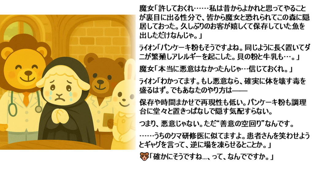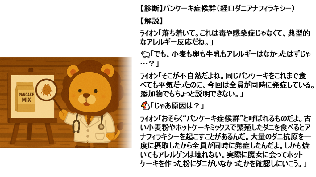 ライオン「おそらく“パンケーキ症候群”と呼ばれるものだよ。古い小麦粉やホットケーキミックスで繁殖したダニを食べるとアナフィラキシーを起こすことがあるんだ。大量のダニ抗原を一度に摂取したから全員が同時に発症したんだよ。しかも焼いてもアレルゲンは壊れない。実際に魔女に会ってホットケーキを作った粉にダニがいなかったかを確認しにいこう。」