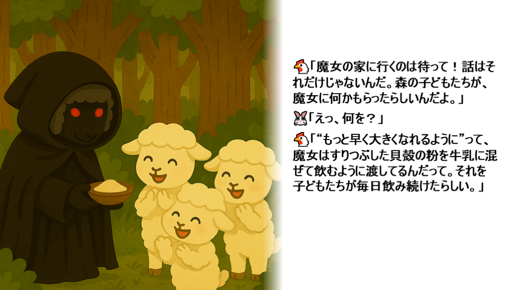 🐔「“もっと早く大きくなれるように”って、魔女はすりつぶした貝殻の粉を牛乳に混ぜて飲むように渡してるんだって。それを子どもたちが毎日飲み続けたらしい。」