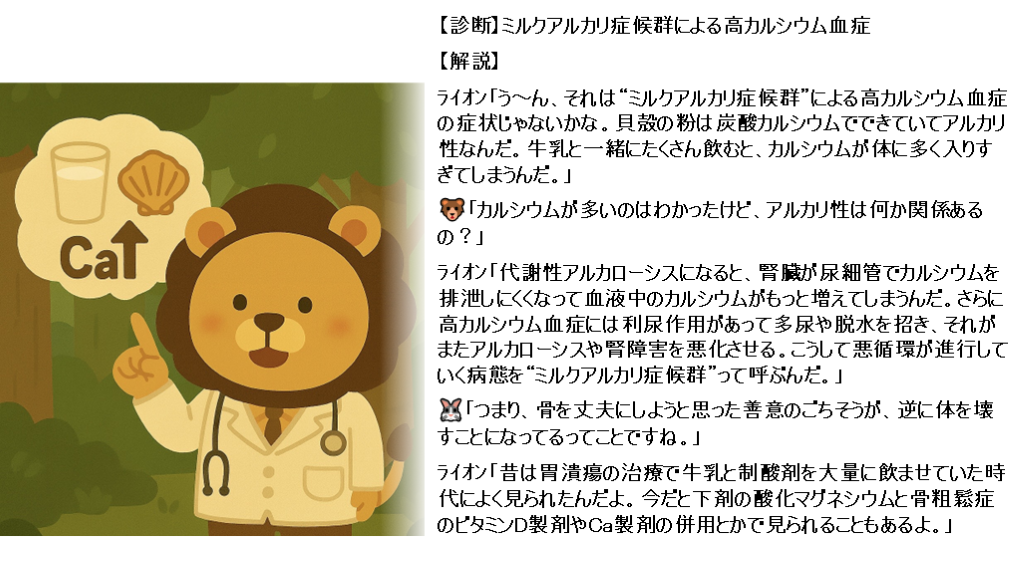 ライオン「代謝性アルカローシスになると、腎臓が尿細管でカルシウムを排泄しにくくなって血液中のカルシウムがもっと増えてしまうんだ。さらに高カルシウム血症には利尿作用があって多尿や脱水を招き、それがまたアルカローシスや腎障害を悪化させる。こうして悪循環が進行していく病態を“ミルクアルカリ症候群”って呼ぶんだ。」