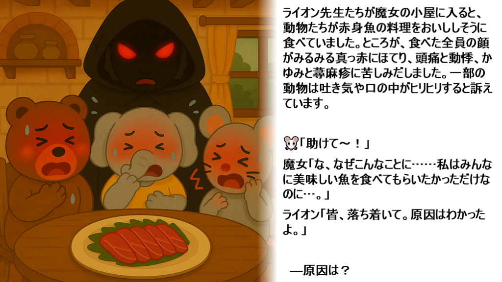 #12. ライオン先生たちが魔女の小屋に入ると、動物たちが赤身魚の料理をおいししそうに食べていました。ところが、食べた全員の顔がみるみる真っ赤にほてり、頭痛と動悸、かゆみと蕁麻疹に苦しみだしました。一部の動物は吐き気や口の中がヒリヒリすると訴えています。