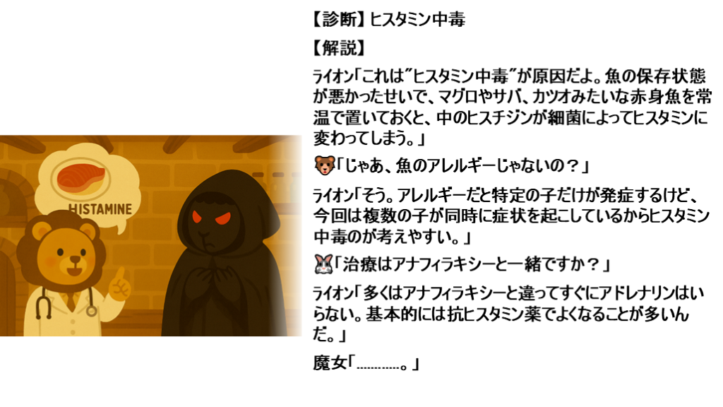 ライオン「そう。アレルギーだと特定の子だけが発症するけど、今回は複数の子が同時に症状を起こしているからヒスタミン中毒のが考えやすい。」