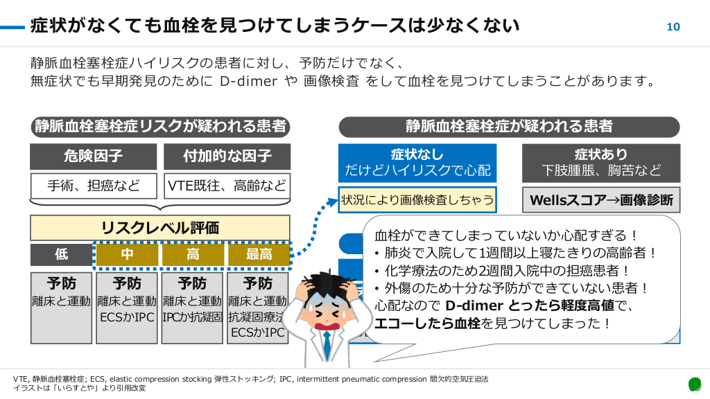 #10. 症状がなくても血栓を見つけてしまうケースは少なくない 10 静脈血栓塞栓症ハイリスクの患者に対し、予防だけでなく、 無症状でも早期発見のために D-dimer や 画像検査 をして血栓を見つけてしまうことがあります。 静脈血栓塞栓症リスクが疑われる患者 危険因子 付加的な因子 手術、担癌など VTE既往、高齢など リスクレベル評価 低 中 高 最高 予防 予防 予防 予防 離床と運動 離床と運動 離床と運動 離床と運動 ECSかIPC IPCか抗凝固 抗凝固療法 ECSかIPC 静脈血栓塞栓症が疑われる患者 症状なし だけどハイリスクで心配 症状あり 下肢腫脹、胸苦など 状況により画像検査しちゃう Wellsスコア→画像診断 血栓ができてしまっていないか心配すぎる! 静脈血栓塞栓症が確認された場合 • 肺炎で入院して1週間以上寝たきりの高齢者! 無症候性 • 化学療法のため2週間入院中の担癌患者! 症候性 • 外傷のため十分な予防ができていない患者! 末梢型 中枢型や 心配なので D-dimer とったら軽度高値で、 (下腿に限局) 肺血栓塞栓症 エコーしたら血栓を見つけてしまった! 状況による 抗凝固療法 抗凝固療法 VTE, 静脈血栓塞栓症; ECS, elastic compression stocking 弾性ストッキング; IPC, intermittent pneumatic compression 間欠的空気圧迫法 イラストは「いらすとや」より引用改変