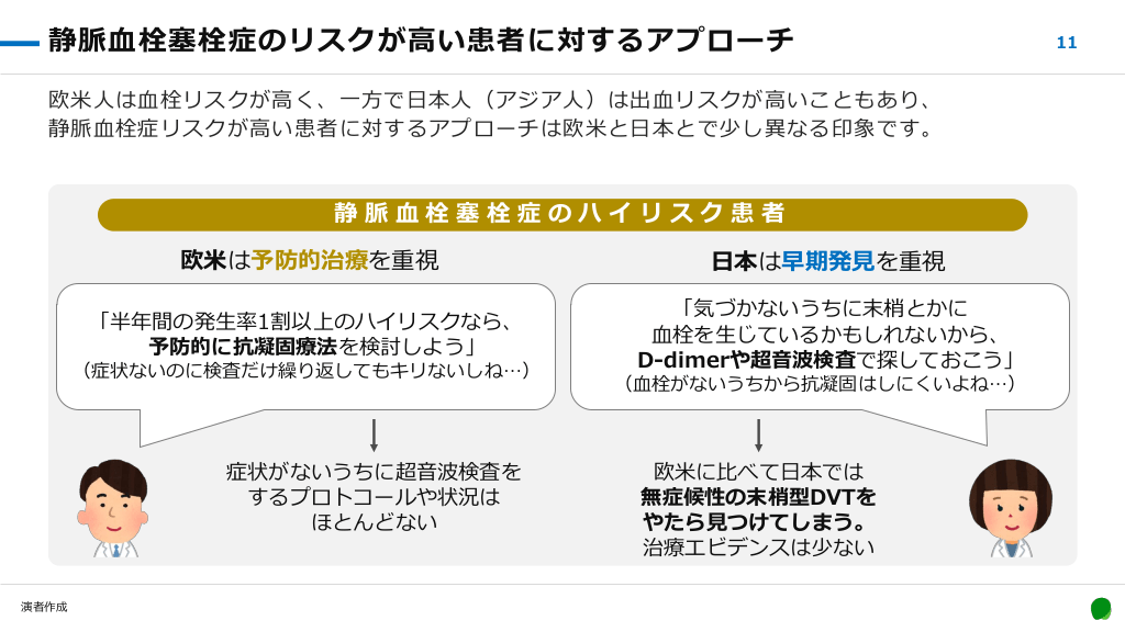 #11. 静脈血栓塞栓症のリスクが高い患者に対するアプローチ 欧米人は血栓リスクが高く、一方で日本人(アジア人)は出血リスクが高いこともあり、 静脈血栓症リスクが高い患者に対するアプローチは欧米と日本とで少し異なる印象です。 静脈血栓塞栓症のハイリスク患者 欧米は予防的治療を重視 日本は早期発見を重視 「半年間の発生率1割以上のハイリスクなら、 予防的に抗凝固療法を検討しよう」 「気づかないうちに末梢とかに 血栓を生じているかもしれないから、 D-dimerや超音波検査で探しておこう」 (症状ないのに検査だけ繰り返してもキリないしね…) 症状がないうちに超音波検査を するプロトコールや状況は ほとんどない 演者作成 (血栓がないうちから抗凝固はしにくいよね…) 欧米に比べて日本では 無症候性の末梢型DVTを やたら見つけてしまう。 治療エビデンスは少ない 11