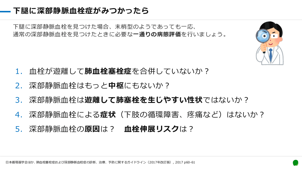 #13. 下腿に深部静脈血栓症がみつかったら 下腿に深部静脈血栓を見つけた場合、末梢型のようであっても一応、 通常の深部静脈血栓を見つけたときに必要な一通りの病態評価を行いましょう。 1. 血栓が遊離して肺血栓塞栓症を合併していないか? 2. 深部静脈血栓はもっと中枢にもないか? 3. 深部静脈血栓は遊離して肺塞栓を生じやすい性状ではないか? 4. 深部静脈血栓による症状(下肢の循環障害、疼痛など)はないか? 5. 深部静脈血栓の原因は? 血栓伸展リスクは? 日本循環器学会ほか. 肺血栓塞栓症および深部静脈血栓症の診断、治療、予防に関するガイドライン(2017年改訂版), 2017 p60-61