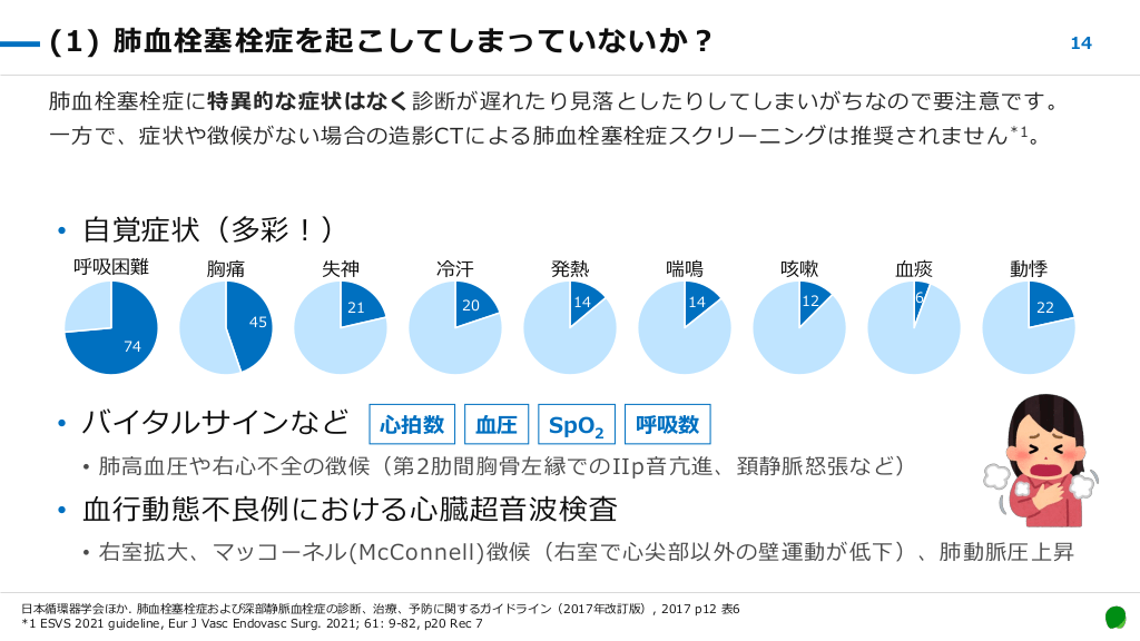 #14. (1) 肺血栓塞栓症を起こしてしまっていないか? 14 肺血栓塞栓症に特異的な症状はなく診断が遅れたり見落としたりしてしまいがちなので要注意です。 一方で、症状や徴候がない場合の造影CTによる肺血栓塞栓症スクリーニングは推奨されません *1 。 • 自覚症状(多彩!) 呼吸困難 胸痛 失神 45 冷汗 20 21 発熱 喘鳴 咳嗽 14 14 12 血痰 6 動悸 22 74 • バイタルサインなど 心拍数 血圧 SpO2 呼吸数 • 肺高血圧や右心不全の徴候(第2肋間胸骨左縁でのIIp音亢進、頚静脈怒張など) • 血行動態不良例における心臓超音波検査 • 右室拡大、マッコーネル(McConnell)徴候(右室で心尖部以外の壁運動が低下)、肺動脈圧上昇 日本循環器学会ほか. 肺血栓塞栓症および深部静脈血栓症の診断、治療、予防に関するガイドライン(2017年改訂版), 2017 p12 表6 *1 ESVS 2021 guideline, Eur J Vasc Endovasc Surg. 2021; 61: 9-82, p20 Rec 7