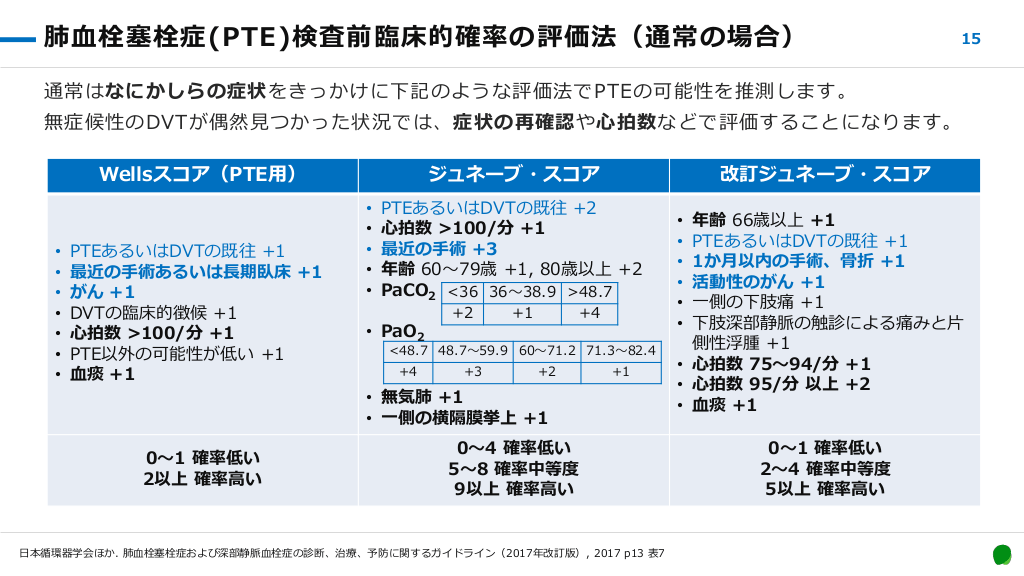 #15. 肺血栓塞栓症(PTE)検査前臨床的確率の評価法(通常の場合) 15 通常はなにかしらの症状をきっかけに下記のような評価法でPTEの可能性を推測します。 無症候性のDVTが偶然見つかった状況では、症状の再確認や心拍数などで評価することになります。 Wellsスコア(PTE用) • • • • • • • PTEあるいはDVTの既往 +1 最近の手術あるいは長期臥床 +1 がん +1 DVTの臨床的徴候 +1 心拍数 >100/分 +1 PTE以外の可能性が低い +1 血痰 +1 ジュネーブ・スコア • • • • • 改訂ジュネーブ・スコア PTEあるいはDVTの既往 +2 心拍数 >100/分 +1 最近の手術 +3 年齢 60~79歳 +1, 80歳以上 +2 PaCO2 <36 36~38.9 >48.7 • PaO2 +2 +1 +4 <48.7 48.7~59.9 60~71.2 71.3~82.4 +4 +3 +2 +1 • 無気肺 +1 • 一側の横隔膜挙上 +1 0~1 確率低い 2以上 確率高い 0~4 確率低い 5~8 確率中等度 9以上 確率高い 日本循環器学会ほか. 肺血栓塞栓症および深部静脈血栓症の診断、治療、予防に関するガイドライン(2017年改訂版), 2017 p13 表7 年齢 66歳以上 +1 PTEあるいはDVTの既往 +1 1か月以内の手術、骨折 +1 活動性のがん +1 一側の下肢痛 +1 下肢深部静脈の触診による痛みと片 側性浮腫 +1 • 心拍数 75~94/分 +1 • 心拍数 95/分 以上 +2 • 血痰 +1 • • • • • • 0~1 確率低い 2~4 確率中等度 5以上 確率高い