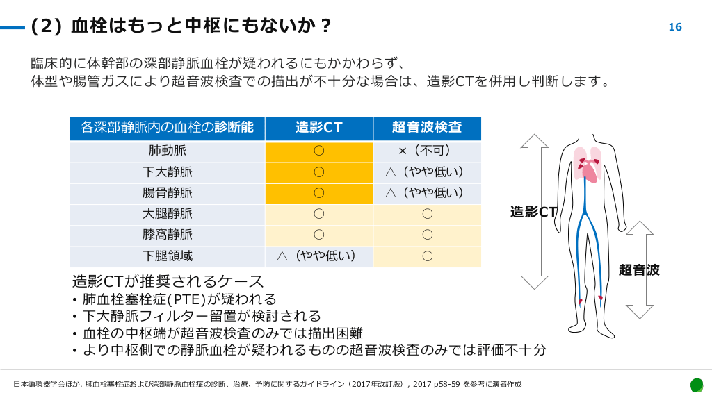 #16. (2) 血栓はもっと中枢にもないか? 16 臨床的に体幹部の深部静脈血栓が疑われるにもかかわらず、 体型や腸管ガスにより超音波検査での描出が不十分な場合は、造影CTを併用し判断します。 各深部静脈内の血栓の診断能 造影CT 超音波検査 肺動脈 ○ ×(不可) 下大静脈 ○ △(やや低い) 腸骨静脈 ○ △(やや低い) 大腿静脈 ○ ○ 膝窩静脈 ○ ○ 下腿領域 △(やや低い) ○ 造影CT 造影CTが推奨されるケース • • • • 肺血栓塞栓症(PTE)が疑われる 下大静脈フィルター留置が検討される 血栓の中枢端が超音波検査のみでは描出困難 より中枢側での静脈血栓が疑われるものの超音波検査のみでは評価不十分 日本循環器学会ほか. 肺血栓塞栓症および深部静脈血栓症の診断、治療、予防に関するガイドライン(2017年改訂版), 2017 p58-59 を参考に演者作成 超音波