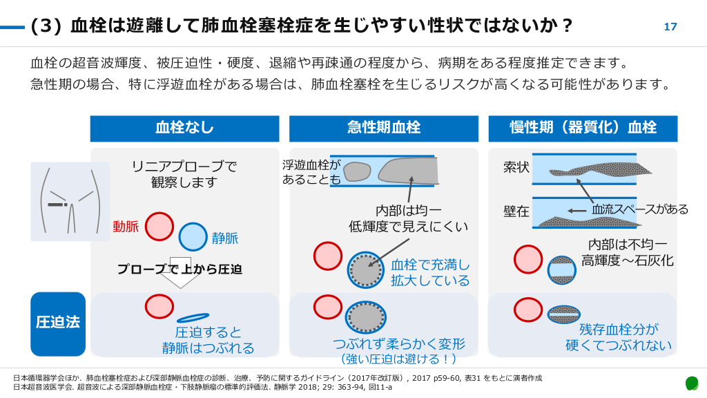 #17. (3) 血栓は遊離して肺血栓塞栓症を生じやすい性状ではないか? 17 血栓の超音波輝度、被圧迫性・硬度、退縮や再疎通の程度から、病期をある程度推定できます。 急性期の場合、特に浮遊血栓がある場合は、肺血栓塞栓を生じるリスクが高くなる可能性があります。 血栓なし リニアプローブで 観察します 動脈 静脈 プローブで上から圧迫 圧迫法 圧迫すると 静脈はつぶれる 急性期血栓 浮遊血栓が あることも 慢性期(器質化)血栓 索状 内部は均一 低輝度で見えにくい 壁在 血栓で充満し 拡大している つぶれず柔らかく変形 (強い圧迫は避ける!) 日本循環器学会ほか.肺血栓塞栓症および深部静脈血栓症の診断、治療、予防に関するガイドライン(2017年改訂版), 2017 p59-60, 表31 をもとに演者作成 日本超音波医学会. 超音波による深部静脈血栓症・下肢静脈瘤の標準的評価法. 静脈学 2018; 29: 363-94, 図11-a 血流スペースがある 内部は不均一 高輝度~石灰化 残存血栓分が 硬くてつぶれない