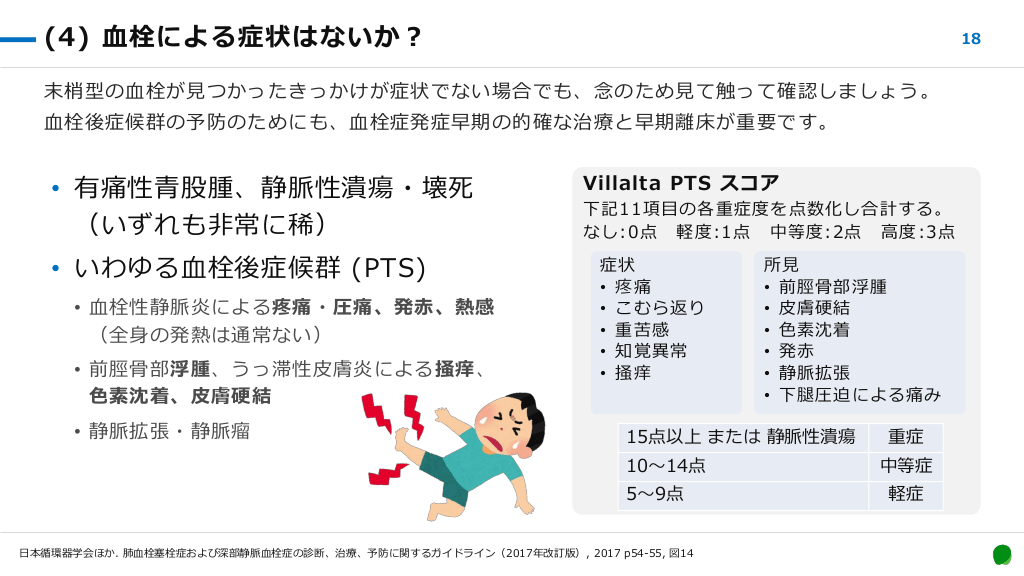 #18. (4) 血栓による症状はないか? 18 末梢型の血栓が見つかったきっかけが症状でない場合でも、念のため見て触って確認しましょう。 血栓後症候群の予防のためにも、血栓症発症早期の的確な治療と早期離床が重要です。 • 有痛性青股腫、静脈性潰瘍・壊死 (いずれも非常に稀) • いわゆる血栓後症候群 (PTS) • 血栓性静脈炎による疼痛・圧痛、発赤、熱感 (全身の発熱は通常ない) • 前脛骨部浮腫、うっ滞性皮膚炎による掻痒、 色素沈着、皮膚硬結 • 静脈拡張・静脈瘤 Villalta PTS スコア 下記11項目の各重症度を点数化し合計する。 なし:0点 軽度:1点 中等度:2点 高度:3点 症状 • 疼痛 • こむら返り • 重苦感 • 知覚異常 • 掻痒 所見 • 前脛骨部浮腫 • 皮膚硬結 • 色素沈着 • 発赤 • 静脈拡張 • 下腿圧迫による痛み 15点以上 または 静脈性潰瘍 10~14点 5~9点 日本循環器学会ほか. 肺血栓塞栓症および深部静脈血栓症の診断、治療、予防に関するガイドライン(2017年改訂版), 2017 p54-55, 図14 重症 中等症 軽症