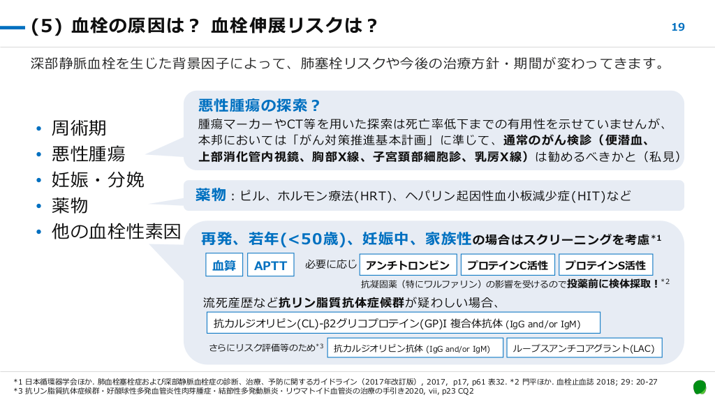 #19. (5) 血栓の原因は? 血栓伸展リスクは? 19 深部静脈血栓を生じた背景因子によって、肺塞栓リスクや今後の治療方針・期間が変わってきます。 悪性腫瘍の探索? • • • • • 腫瘍マーカーやCT等を用いた探索は死亡率低下までの有用性を示せていませんが、 周術期 本邦においては「がん対策推進基本計画」に準じて、通常のがん検診(便潜血、 悪性腫瘍 上部消化管内視鏡、胸部X線、子宮頚部細胞診、乳房X線)は勧めるべきかと(私見) 妊娠・分娩 薬物 :ピル、ホルモン療法(HRT)、ヘパリン起因性血小板減少症(HIT)など 薬物 他の血栓性素因 再発、若年(<50歳)、妊娠中、家族性 の場合はスクリーニングを考慮 *1 血算 APTT 必要に応じ アンチトロンビン プロテインC活性 プロテインS活性 抗凝固薬(特にワルファリン)の影響を受けるので投薬前に検体採取!*2 流死産歴など抗リン脂質抗体症候群が疑わしい場合、 抗カルジオリピン(CL)-β2グリコプロテイン(GP)I 複合体抗体 (IgG and/or IgM) さらにリスク評価等のため*3 抗カルジオリピン抗体 (IgG and/or IgM) ループスアンチコアグラント(LAC) *1 日本循環器学会ほか. 肺血栓塞栓症および深部静脈血栓症の診断、治療、予防に関するガイドライン(2017年改訂版), 2017, p17, p61 表32. *2 門平ほか. 血栓止血誌 2018; 29: 20-27 *3 抗リン脂質抗体症候群・好酸球性多発血管炎性肉芽腫症・結節性多発動脈炎・リウマトイド血管炎の治療の手引き2020, vii, p23 CQ2
