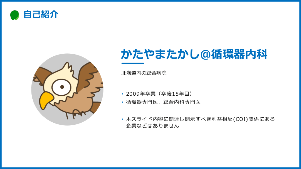 #2. 自己紹介 かたやまたかし@循環器内科 北海道内の総合病院 • 2009年卒業(卒後15年目) • 循環器専門医、総合内科専門医 • 本スライド内容に関連し開示すべき利益相反(COI)関係にある 企業などはありません