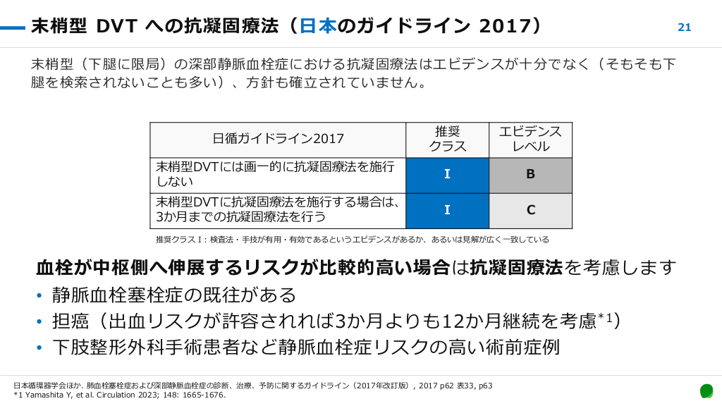 #21. 末梢型 DVT への抗凝固療法(日本のガイドライン 2017) 末梢型(下腿に限局)の深部静脈血栓症における抗凝固療法はエビデンスが十分でなく(そもそも下 腿を検索されないことも多い)、方針も確立されていません。 日循ガイドライン2017 推奨 クラス エビデンス レベル 末梢型DVTには画一的に抗凝固療法を施行 しない I B 末梢型DVTに抗凝固療法を施行する場合は、 3か月までの抗凝固療法を行う I C 推奨クラス I : 検査法・手技が有用・有効であるというエビデンスがあるか、あるいは見解が広く一致している 血栓が中枢側へ伸展するリスクが比較的高い場合は抗凝固療法を考慮します • 静脈血栓塞栓症の既往がある • 担癌(出血リスクが許容されれば3か月よりも12か月継続を考慮 *1 ) • 下肢整形外科手術患者など静脈血栓症リスクの高い術前症例 日本循環器学会ほか. 肺血栓塞栓症および深部静脈血栓症の診断、治療、予防に関するガイドライン(2017年改訂版), 2017 p62 表33, p63 *1 Yamashita Y, et al. Circulation 2023; 148: 1665-1676. 21
