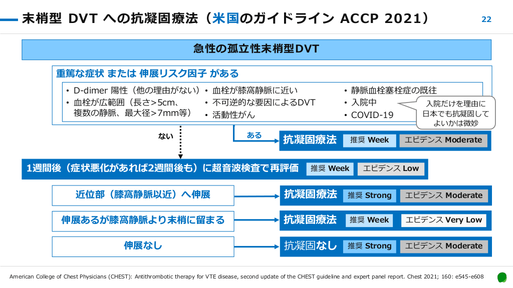 #22. 末梢型 DVT への抗凝固療法(米国のガイドライン ACCP 2021) 22 急性の孤立性末梢型DVT 重篤な症状 または 伸展リスク因子 がある • D-dimer 陽性(他の理由がない) • 血栓が膝窩静脈に近い • 血栓が広範囲(長さ>5cm、 • 不可逆的な要因によるDVT 複数の静脈、最大径>7mm等) • 活動性がん ない ある • 静脈血栓塞栓症の既往 • 入院中 入院だけを理由に 日本でも抗凝固して • COVID-19 よいかは微妙 抗凝固療法 1週間後(症状悪化があれば2週間後も)に超音波検査で再評価 推奨 Week 推奨 Week エビデンス Moderate エビデンス Low 近位部(膝窩静脈以近)へ伸展 抗凝固療法 推奨 Strong エビデンス Moderate 伸展あるが膝窩静脈より末梢に留まる 抗凝固療法 推奨 Week エビデンス Very Low 伸展なし 抗凝固なし 推奨 Strong エビデンス Moderate American College of Chest Physicians (CHEST): Antithrombotic therapy for VTE disease, second update of the CHEST guideline and expert panel report. Chest 2021; 160: e545-e608