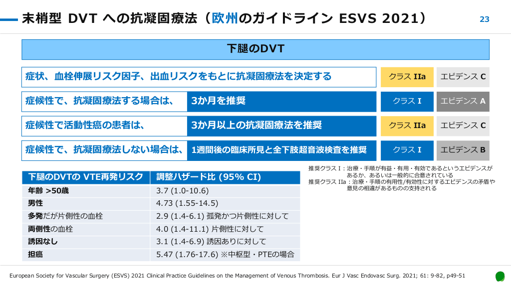 #23. 末梢型 DVT への抗凝固療法(欧州のガイドライン ESVS 2021) 23 下腿のDVT 症状、血栓伸展リスク因子、出血リスクをもとに抗凝固療法を決定する 症候性で、抗凝固療法する場合は、 3か月を推奨 症候性で活動性癌の患者は、 3か月以上の抗凝固療法を推奨 症候性で、抗凝固療法しない場合は、 1週間後の臨床所見と全下肢超音波検査を推奨 下腿のDVTの VTE再発リスク 調整ハザード比 (95% CI) 年齢 >50歳 3.7 (1.0-10.6) 男性 4.73 (1.55-14.5) 多発だが片側性の血栓 2.9 (1.4-6.1) 孤発かつ片側性に対して 両側性の血栓 4.0 (1.4-11.1) 片側性に対して 誘因なし 3.1 (1.4-6.9) 誘因ありに対して 担癌 5.47 (1.76-17.6) ※中枢型・PTEの場合 クラス IIa エビデンス C クラス I エビデンス A クラス IIa エビデンス C クラス I エビデンス B 推奨クラス I : 治療・手順が有益・有用・有効であるというエビデンスが あるか、あるいは一般的に合意されている 推奨クラス IIa : 治療・手順の有用性/有効性に対するエビデンスの矛盾や 意見の相違があるものの支持される European Society for Vascular Surgery (ESVS) 2021 Clinical Practice Guidelines on the Management of Venous Thrombosis. Eur J Vasc Endovasc Surg. 2021; 61: 9-82, p49-51