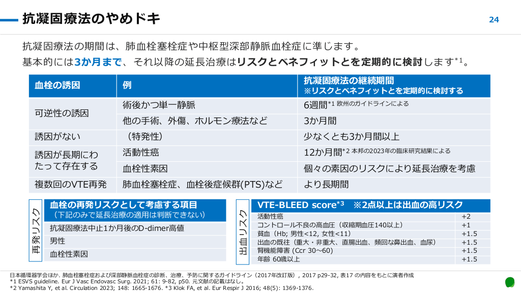 #24. 抗凝固療法のやめドキ 24 抗凝固療法の期間は、肺血栓塞栓症や中枢型深部静脈血栓症に準じます。 基本的には3か月まで、それ以降の延長治療はリスクとベネフィットとを定期的に検討します *1 。 血栓の誘因 抗凝固療法の継続期間 例 ※リスクとベネフィットとを定期的に検討する 術後かつ単一静脈 6週間*1 欧州のガイドラインによる 他の手術、外傷、ホルモン療法など 3か月間 誘因がない (特発性) 少なくとも3か月間以上 誘因が長期にわ たって存在する 活動性癌 12か月間*2 本邦の2023年の臨床研究結果による 血栓性素因 個々の素因のリスクにより延長治療を考慮 複数回のVTE再発 肺血栓塞栓症、血栓後症候群(PTS)など より長期間 血栓の再発リスクとして考慮する項目 (下記のみで延長治療の適用は判断できない) 抗凝固療法中止1か月後のD-dimer高値 男性 血栓性素因 VTE-BLEED score*3 出血リスク 再発リスク 可逆性の誘因 ※2点以上は出血の高リスク 活動性癌 コントロール不良の高血圧(収縮期血圧140以上) 貧血(Hb; 男性<12, 女性<11) 出血の既往(重大・非重大、直腸出血、頻回な鼻出血、血尿) 腎機能障害 (Ccr 30~60) 年齢 60歳以上 日本循環器学会ほか. 肺血栓塞栓症および深部静脈血栓症の診断、治療、予防に関するガイドライン(2017年改訂版), 2017 p29-32, 表17 の内容をもとに演者作成 *1 ESVS guideline. Eur J Vasc Endovasc Surg. 2021; 61: 9-82, p50. 元文献の記載はなし。 *2 Yamashita Y, et al. Circulation 2023; 148: 1665-1676. *3 Klok FA, et al. Eur Respir J 2016; 48(5): 1369-1376. +2 +1 +1.5 +1.5 +1.5 +1.5