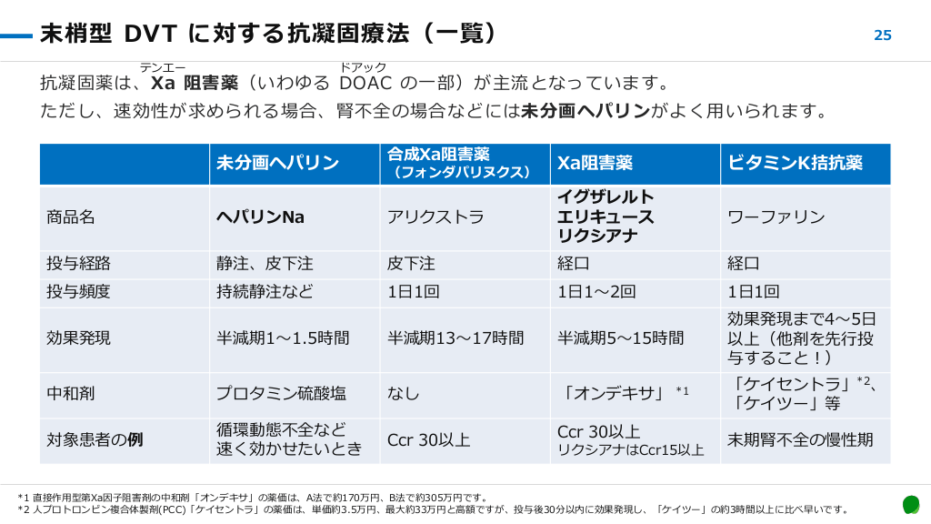 #25. 末梢型 DVT に対する抗凝固療法(一覧) テンエー 25 ドアック 抗凝固薬は、Xa 阻害薬(いわゆる DOAC の一部)が主流となっています。 ただし、速効性が求められる場合、腎不全の場合などには未分画ヘパリンがよく用いられます。 未分画ヘパリン 合成Xa阻害薬 (フォンダパリヌクス) Xa阻害薬 ビタミンK拮抗薬 ワーファリン 商品名 ヘパリンNa アリクストラ イグザレルト エリキュース リクシアナ 投与経路 静注、皮下注 皮下注 経口 経口 投与頻度 持続静注など 1日1回 1日1~2回 1日1回 効果発現 半減期1~1.5時間 半減期13~17時間 半減期5~15時間 効果発現まで4~5日 以上(他剤を先行投 与すること!) 中和剤 プロタミン硫酸塩 なし 「オンデキサ」 「ケイセントラ」*2、 「ケイツー」等 対象患者の例 循環動態不全など 速く効かせたいとき Ccr 30以上 *1 Ccr 30以上 リクシアナはCcr15以上 末期腎不全の慢性期 *1 直接作用型第Xa因子阻害剤の中和剤「オンデキサ」の薬価は、A法で約170万円、B法で約305万円です。 *2 人プロトロンビン複合体製剤(PCC)「ケイセントラ」の薬価は、単価約3.5万円、最大約33万円と高額ですが、投与後30分以内に効果発現し、「ケイツー」の約3時間以上に比べ早いです。
