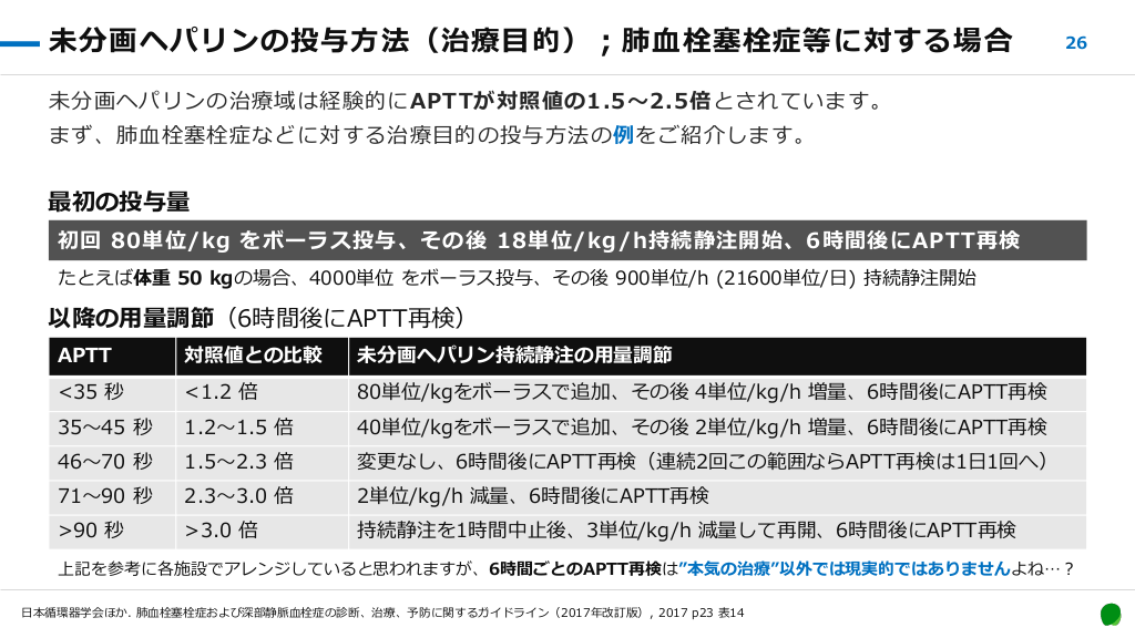 #26. 未分画ヘパリンの投与方法(治療目的);肺血栓塞栓症等に対する場合 26 未分画ヘパリンの治療域は経験的にAPTTが対照値の1.5~2.5倍とされています。 まず、肺血栓塞栓症などに対する治療目的の投与方法の例をご紹介します。 最初の投与量 初回 80単位/kg をボーラス投与、その後 18単位/kg /h持続静注開始、6時間後にAPTT再検 たとえば体重 50 kgの場合、4000単位 をボーラス投与、その後 900単位/h (21600単位/日) 持続静注開始 以降の用量調節(6時間後にAPTT再検) APTT 対照値との比較 未分画ヘパリン持続静注の用量調節 <35 秒 <1.2 倍 80単位/kgをボーラスで追加、その後 4単位/kg/h 増量、6時間後にAPTT再検 35~45 秒 1.2~1.5 倍 40単位/kgをボーラスで追加、その後 2単位/kg/h 増量、6時間後にAPTT再検 46~70 秒 1.5~2.3 倍 変更なし、6時間後にAPTT再検(連続2回この範囲ならAPTT再検は1日1回へ) 71~90 秒 2.3~3.0 倍 2単位/kg/h 減量、6時間後にAPTT再検 >90 秒 >3.0 倍 持続静注を1時間中止後、3単位/kg/h 減量して再開、6時間後にAPTT再検 上記を参考に各施設でアレンジしていると思われますが、6時間ごとのAPTT再検は”本気の治療”以外では現実的ではありませんよね…? 日本循環器学会ほか. 肺血栓塞栓症および深部静脈血栓症の診断、治療、予防に関するガイドライン(2017年改訂版), 2017 p23 表14