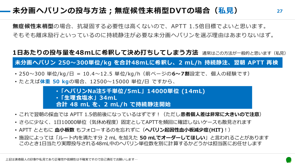 #27. 未分画ヘパリンの投与方法;無症候性末梢型DVTの場合(私見) 27 無症候性末梢型の場合、抗凝固する必要性は高くないので、APTT 1.5倍目標でよいと思います。 そもそも離床励行といっているのに持続静注が必要な未分画ヘパリンを選ぶ理由はあまりないはず。 1日あたりの投与量を48mLに希釈して決め打ちしてしまう方法 通常はこの方法が一般的と思います(私見) 未分画ヘパリン 250~300単位/kg を合計48mLに希釈し、2 mL/h 持続静注、翌朝 APTT 再検 • 250~300 単位/kg /日 = 10.4~12.5 単位/kg /h(前ページの6~7割設定で、個人の経験です) • たとえば体重 50 kgの場合、12500~15000 単位/日 ですから、 •「ヘパリンNa注5千単位/5mL」14000単位 (14mL) •「生理食塩水」34mL 合計 48 mL を、2 mL/h で持続静注開始 • これで翌朝の採血では APTT 1.5倍前後になっているはずです!(ただし患者個人差は非常に大きいので注意) • さらに少なく、1日10000単位(気休め程度)固定としてAPTTを頻回に確認しないケースも散見されます • APTT とともに 血小板数 もフォローするのを忘れずに(ヘパリン起因性血小板減少症(HIT)!) • 施設によっては「ルート内を満たす分 2 mL を加えた 50 mLでオーダーしてほしい」と言われることがあります このとき1日当たり実際投与される48mL中のヘパリン単位数を別に計算するかどうかは担当医にお任せします 上記は演者個人の印象や私見であり正確性や信頼性は不確実ですので自己責任でお願いします…