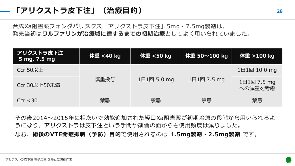 #28. 「アリクストラ皮下注」(治療目的) 28 合成Xa阻害薬フォンダパリヌクス「アリクストラ皮下注」5mg・7.5mg製剤は、 発売当初はワルファリンが治療域に達するまでの初期治療としてよく用いられていました。 アリクストラ皮下注 5 mg, 7.5 mg 体重 <40 kg 体重 <50 kg 体重 50~100 kg Ccr 50以上 Ccr 30以上50未満 Ccr <30 体重 >100 kg 1日1回 10.0 mg 慎重投与 1日1回 5.0 mg 1日1回 7.5 mg 禁忌 禁忌 禁忌 1日1回 7.5 mg への減量を考慮 禁忌 その後2014~2015年に相次いで効能追加された経口Xa阻害薬が初期治療の段階から用いられるよ うになり、アリクストラは皮下注という手間や薬価の面からも使用頻度は減りました。 なお、術後のVTE発症抑制(予防)目的で使用されるのは 1.5mg製剤・2.5mg製剤 です。 アリクストラ皮下注 電子添文 をもとに演者作表